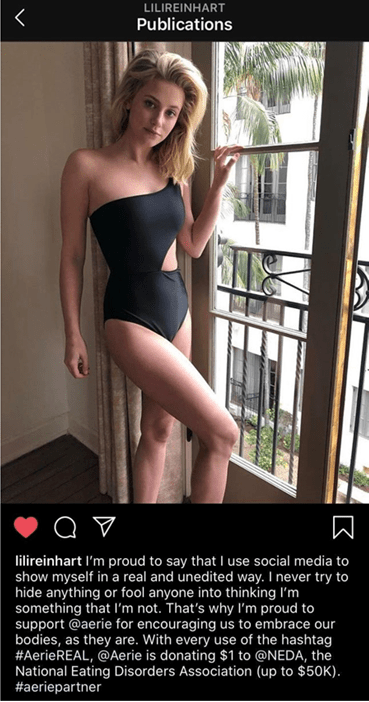 « I’m proud to say that I use social media to show myself in a real and unedited way. […] I’m proud to support @aerie for encouraging us to embrace our bodies, as they are. »