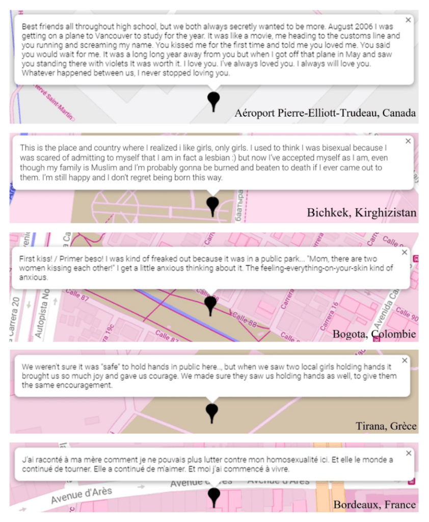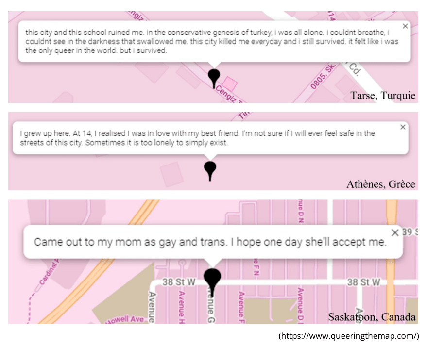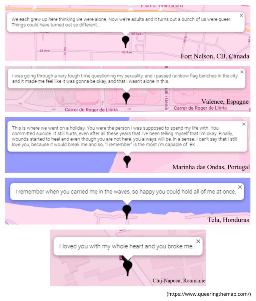 Un des meilleurs exemples de ce phénomène est, je trouve, le site web Queering the Map (https://queeringthemap.com). Ce projet a été fondé en 2017 par Lucas LaRochelle qui étudiait à l’époque à l’Université Concordia. Queering the Map est une initiative à vocation communautaire : tout le monde peut y écrire. Elle s’inscrit dans une idée de counter-mapping en relatant des chroniques queers venant des quatre coins du globe pour les lier à un espace physique. Le counter-mapping est un processus de cartographie allant à l’encontre des structures sociales de pouvoir dominantes qui sert à contester le découpage actuel d’un territoire. Ce terme vient des travaux de Nancy Peluso, en 1995, sur les nations autochtones de la forêt de Kalimantan en Indonésie (The Audiopedia, 2017).