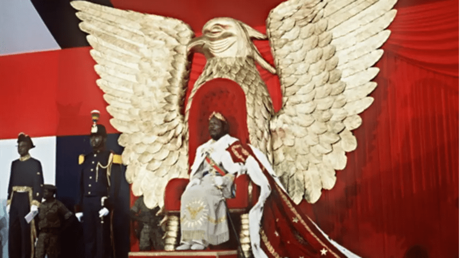 Guillaud, P. (1977, 4 décembre). L’empereur centrafricain Jean-Bedel Bokassa lors de son autoproclamation, à Bangui, le 4 décembre 1977 [image en ligne]. RFI. https://www.rfi.fr/fr/afrique/20190920-reportage-bangui-40-ans-apres-chute-heritage-bokassa